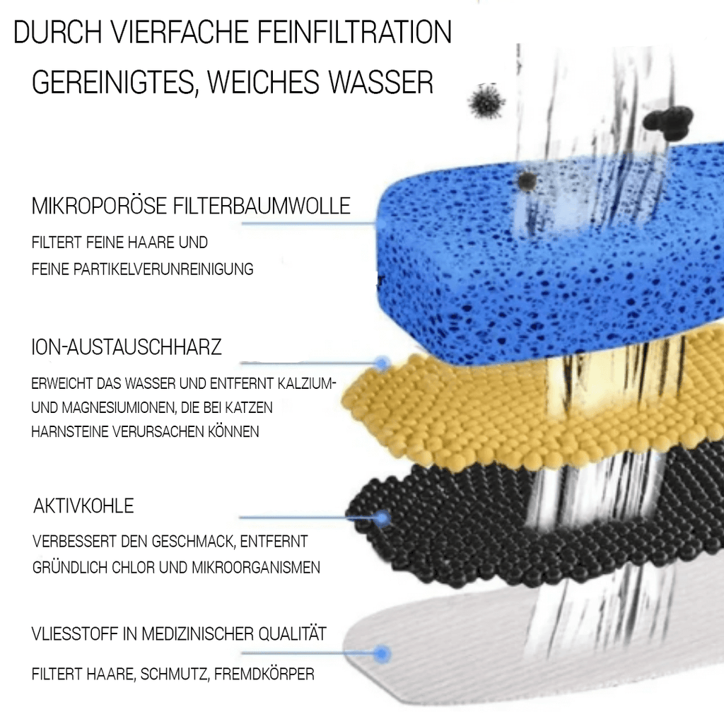 Aus diesem Grund wurde unser Brunnen entwickelt. Sein angepasstes Filtersystem entfernt überschüssige Mineralien, die sich sonst in den Blutgefäßen deiner Katze festsetzen würden. Dadurch werden Nieren - und Harnwegserkrankungen auf lange Sicht vermieden.